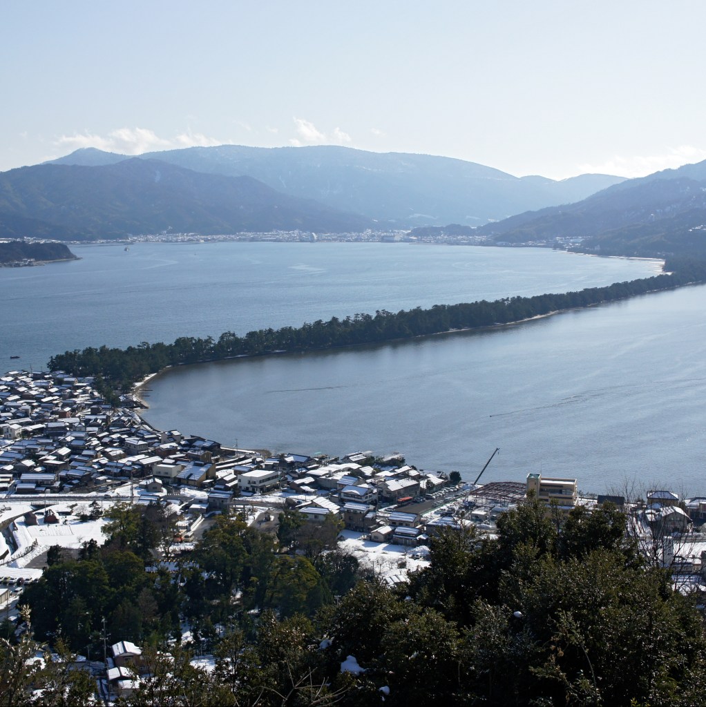 Amanohashidate wird auch als «Himmelsbrücke» bezeichnet. Die Himmelsbrücke ist eine Sandbank in einer Bucht, auf der Kiefern wachsen.